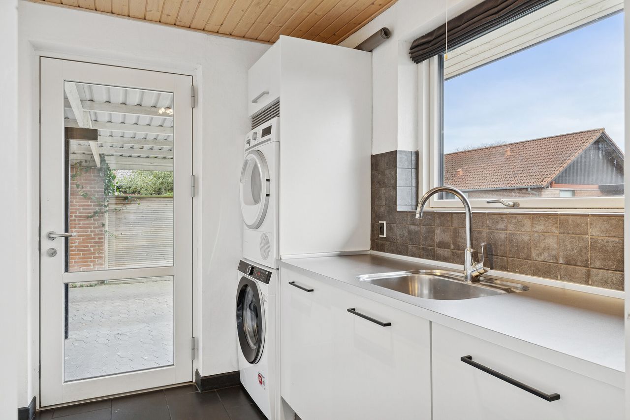 Indenfor venter der jer 159 kvadratmeter, og en gavmild portion af disse er dedikeret til køkken-alrummet og stuen, der går ud i ét. Det lækre opholdsmiljø har store vinduespartier og dobbeltdør ud til haven, og pilleovnen bidrager med hyggelig atmosfære. Det åbne køkken er holdt i et flot, hvidt design, og det har fine opbevaringsforhold og fritstående kogeø.