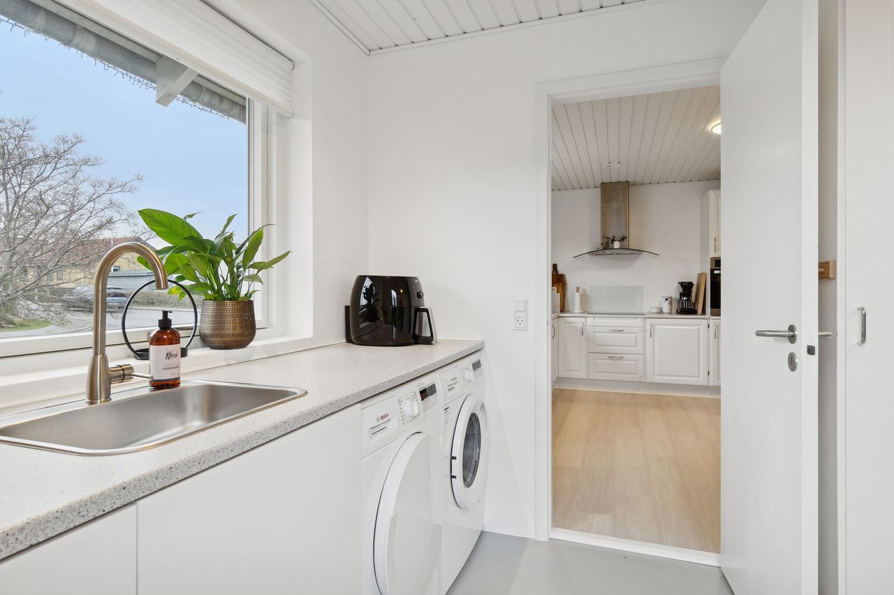 Fra køkkenet er der adgang til bryggerset, og det er med egen indgang direkte fra carporten, mens der i modsatte ende af huset er skabt en særskilt afdeling til værelserne. Her venter fire regulære værelser, et badeværelse med bruseniche og et gæstetoilet. Det ene værelse er endda med egen udgang til haven.