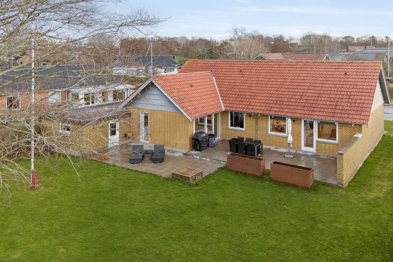 I haven nyder I udelivet på det store terrasseområde, der fanger aftensolens blide lys, og I får også en god græsplæne til børnenes spil og leg. Hertil hører en nedgravet trampolin, og græsset holdes nede af en robotplæneklipper.
